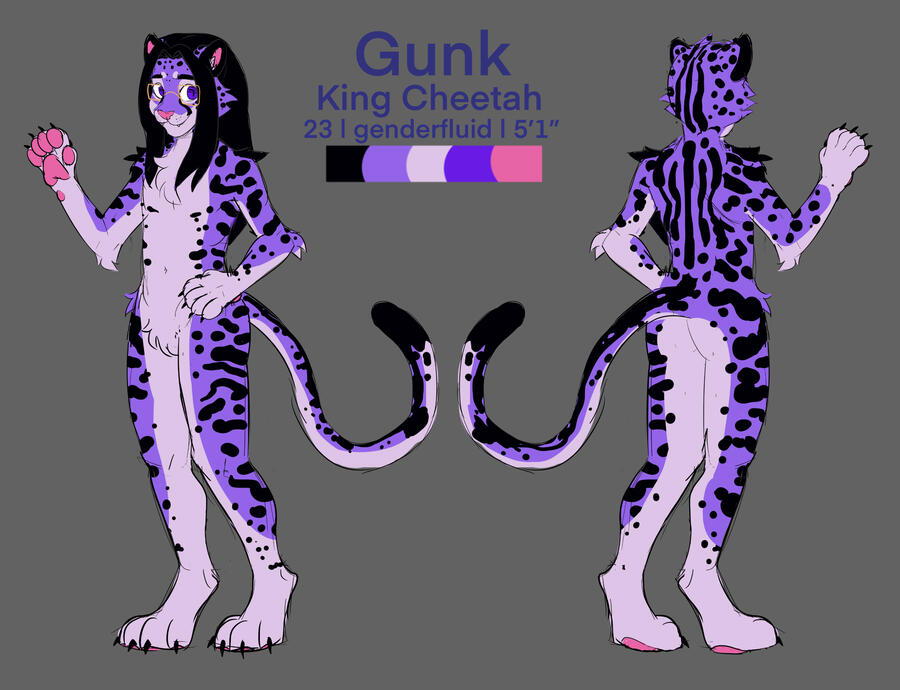 Features a character of your choice with a front and a back view, a maw close up, as well as an outfit and accessories of your choice with a color palette and brief description.