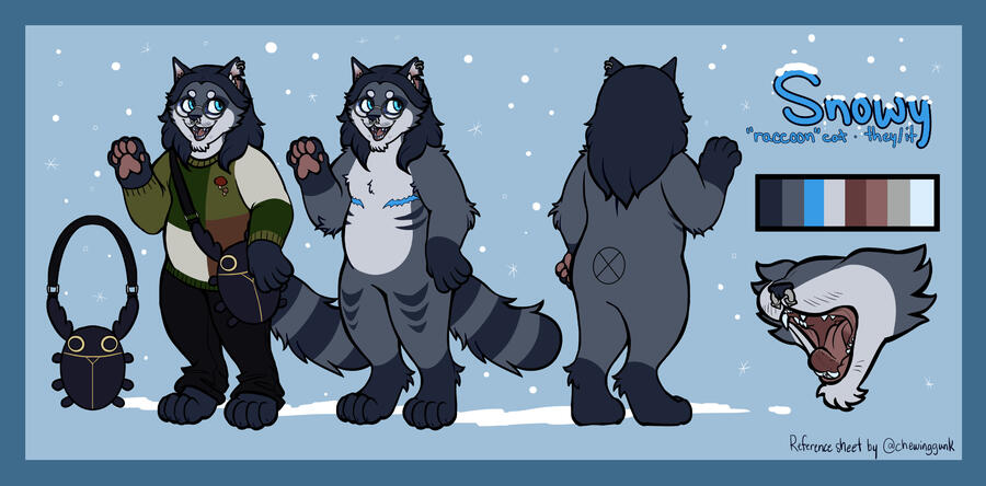 Features a character of your choice with a front and a back view, a maw close up, as well as an outfit and accessories of your choice with a color palette and brief description.